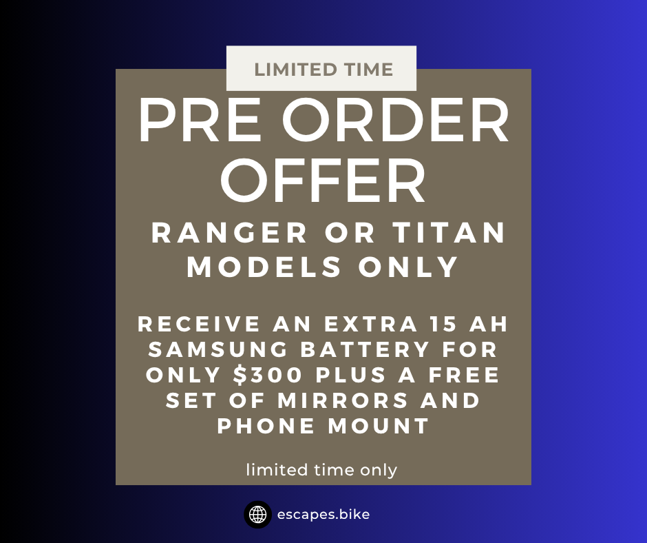 FOR A LIMITED TIME, RECEIVE AN EXTRA 15 AH SAMSUNG BATTERY FOR $300.00 PLUS A FREE SET OF MIRRORS AND PHONE MOUNT WHEN YOU PRE ORDER EITHER THE RANGER OR THE TITAN MODEL!